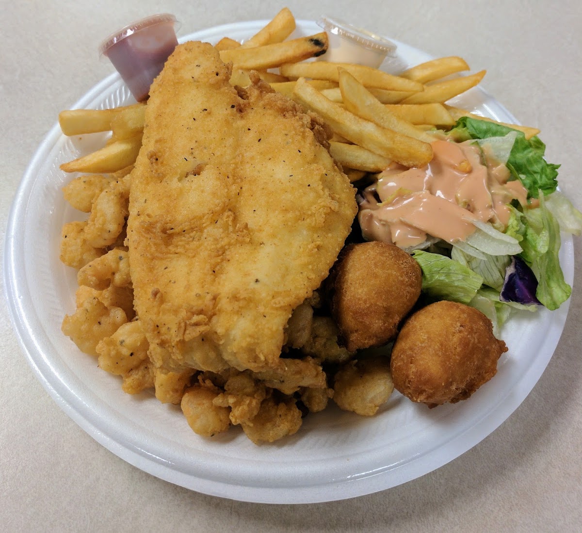 “ If you’re looking for good food and coming down I-95 definitely check out George’s. We ordered the chicken plate, burger box, and flounder and shrimp plate. Burgers were great, flounder, chicken and the salad that came along with it was all delicious. ”