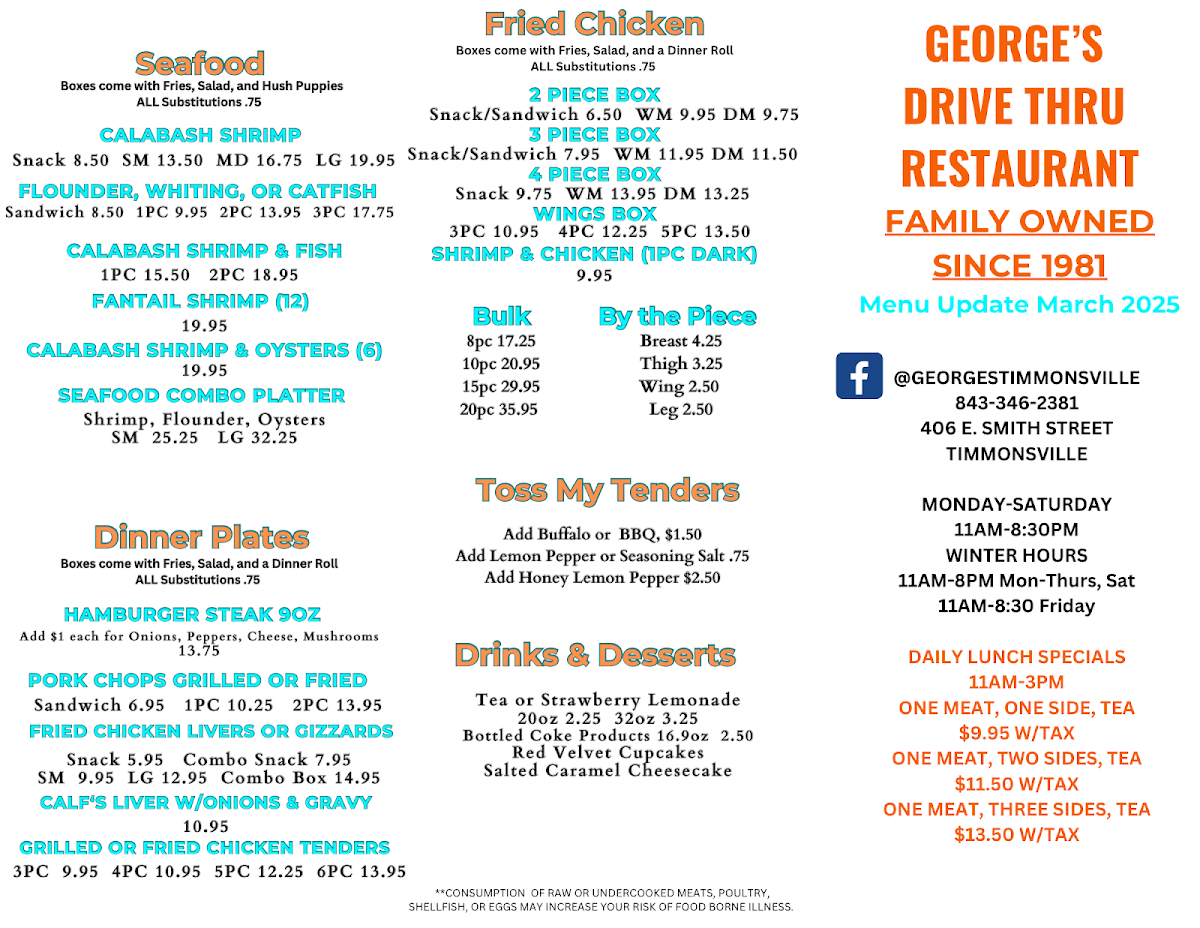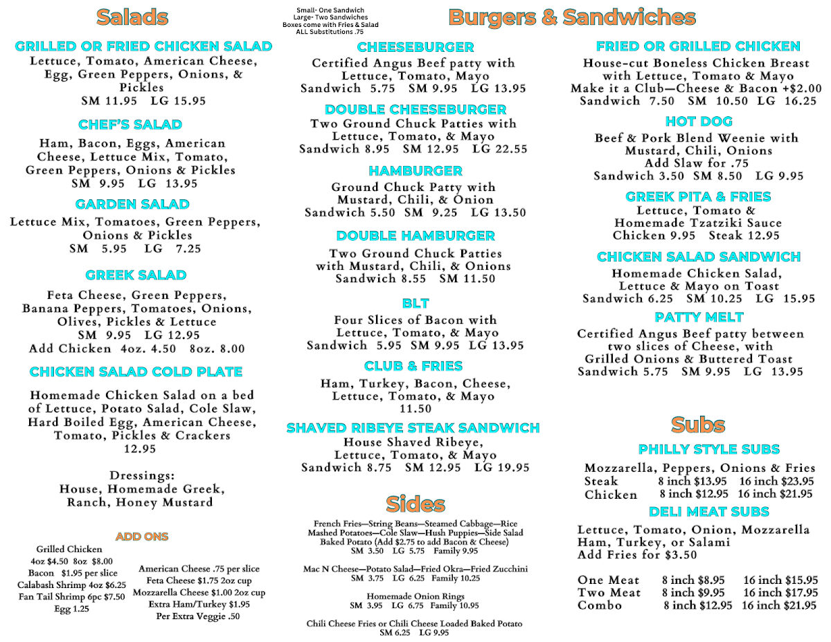 At George's Drive Thru Restaurant, located at 406 E Smith St, Timmonsville, SC, the menu offers a delightful variety of options that cater to various tastes, whether you're in the mood for a light salad or a hearty meal. For salad lovers, options like the Grilled or Fried Chicken Salad, Chef's Salad, Garden Salad, Greek Salad, and the refreshing Chicken Salad Cold Plate are available. If you're craving a burger, choose from the classic Cheeseburger or Double Cheeseburger, or try the Hamburger or Double Hamburger for a simple yet satisfying bite. There's also a tasty BLT for sandwich enthusiasts.